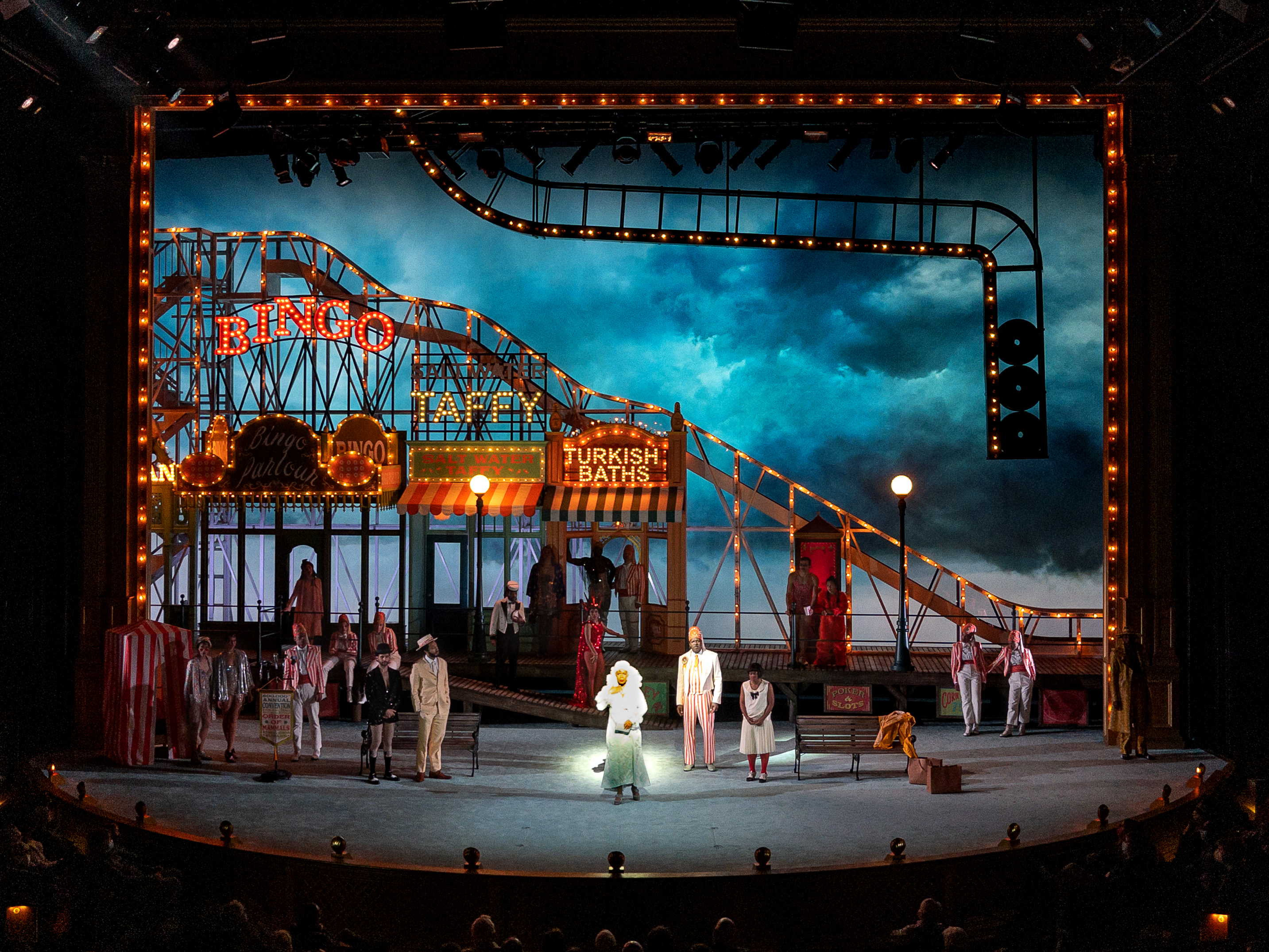 The projection design is comprised of two elements: intricately animated Newsreels that precede each act as stand-alone movies, and expansive environmental projections that underscore the impending climate disasters.